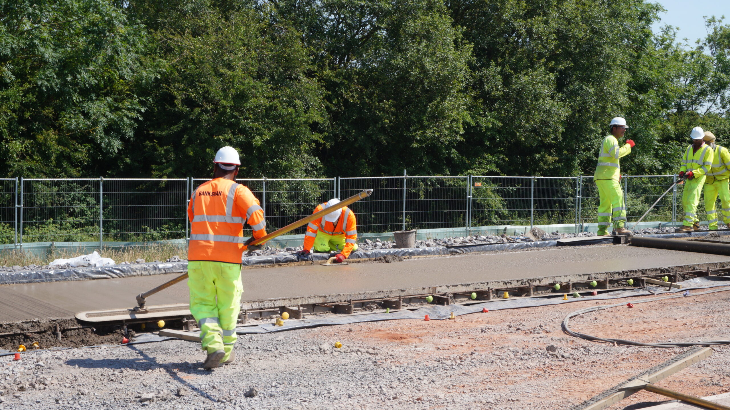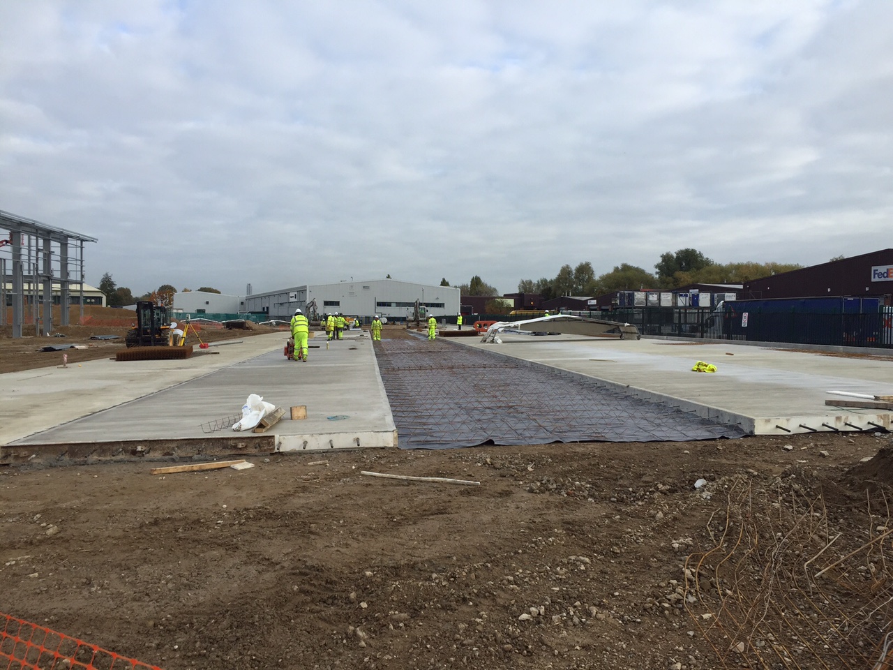 Gill Civil was appointed to deliver 22,500m² of 190mm-thick C32/40 AE reinforced external concrete slabs for DHL’s new Distribution Hub in Slough.
